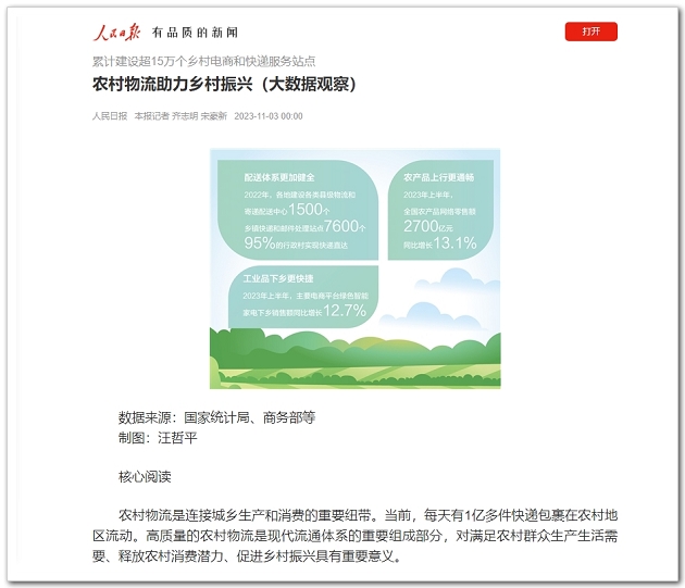 今年初,《中共中央 國務院關于做好2023年全面推進鄉(xiāng)村振興重點工作的意見》提出,加快完善縣鄉(xiāng)村電子商務和快遞物流配送體系,建設縣域集采集配中心,推動農村客貨郵融合發(fā)展,大力發(fā)展共同配送、即時零售等新模式,推動冷鏈物流服務網(wǎng)絡向鄉(xiāng)村下沉。