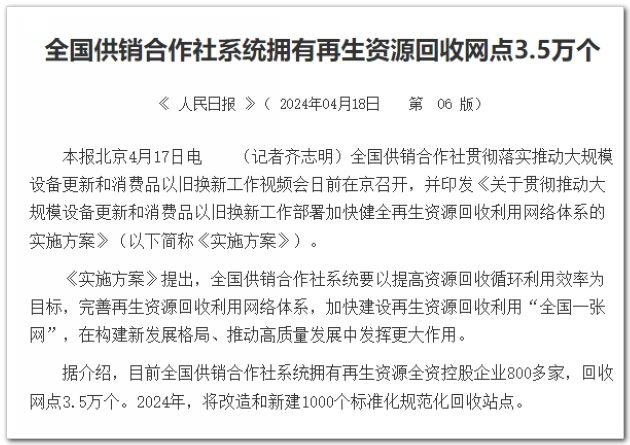 全國供銷合作社貫徹落實推動大規(guī)模設(shè)備更新和消費品以舊換新工作視頻會日前在京召開,并印發(fā)《關(guān)于貫徹推動大規(guī)模設(shè)備更新和消費品以舊換新工作部署加快健全再生資源回收利用網(wǎng)絡(luò)體系的實施方案》(以下簡稱《實施方案》)。