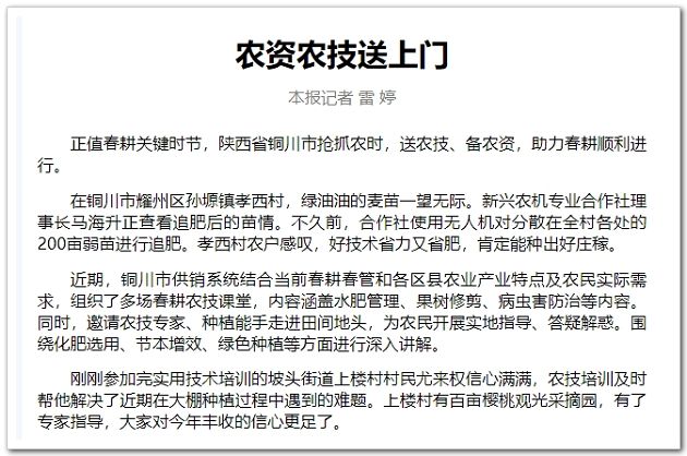 銅川市供銷合作社黨組成員、副主任王婧表示,當?shù)毓膭罡鲄^(qū)縣供銷合作社以農(nóng)資供應為抓手,充分調(diào)動各方資源,推廣“農(nóng)資供應+農(nóng)技培訓+農(nóng)產(chǎn)品購銷+農(nóng)業(yè)社會化服務”的一體化為農(nóng)服務模式,將服務觸角延伸到耕、種、管、收等農(nóng)業(yè)生產(chǎn)全過程。銅川市供銷合作社還充分發(fā)揮農(nóng)資供應主渠道作用,引導農(nóng)資經(jīng)營主體加強市場調(diào)查與分析預測,把握市場趨勢,多渠道組織貨源,做好化肥、農(nóng)藥、農(nóng)膜等春耕生產(chǎn)物資的采購、調(diào)運和供應工作。