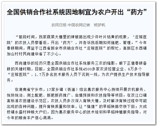 中華全國供銷合作總社相關(guān)負責(zé)人表示,為了滿足春耕大忙時節(jié)農(nóng)民的實際需求,全國供銷合作社系統(tǒng)因地制宜開展生產(chǎn)性全程托管服務(wù)和配方施肥、統(tǒng)防統(tǒng)治、農(nóng)機作業(yè)等農(nóng)業(yè)社會化服務(wù),充分發(fā)揮點多面廣、貼近基層的優(yōu)勢,不斷提升服務(wù)水平,為打好全年農(nóng)業(yè)生產(chǎn)“第一仗”貢獻供銷力量。